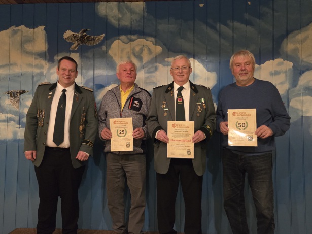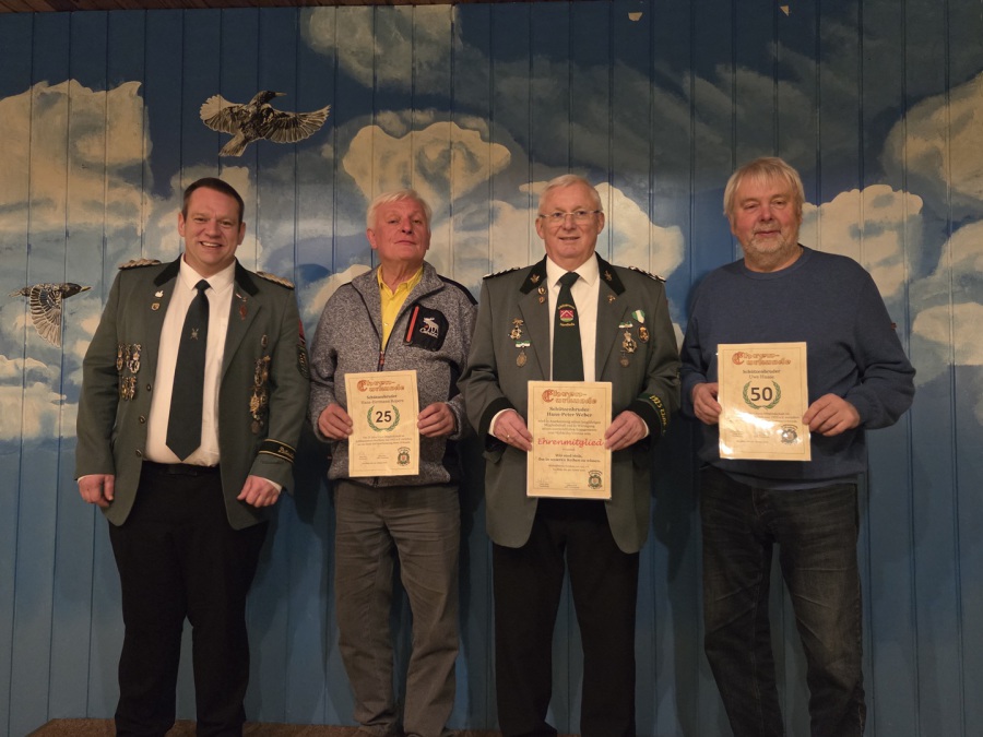 Für 50 Jahre treue Mitgliedschaft zum Verein wurde Uwe Haase geehrt, ebenso Hans-Hermann Ropers für 25 Jahre treue Mitgliedschaft zum Verein. Im Anschluss wählte die Versammlung auf Vorschlag des Vorstandes einstimmig Schützenbruder Hans-Peter Weber zum Ehrenmitglied. „Wir sind stolz Hans-Peter Weber in unseren Reihen zu wissen. Dank seines unermüdlichen Engagements zum Wohle unseres Vereins hat er die Ehrenmitgliedschaft mehr als verdient“, so Präsident Niclas Röse.