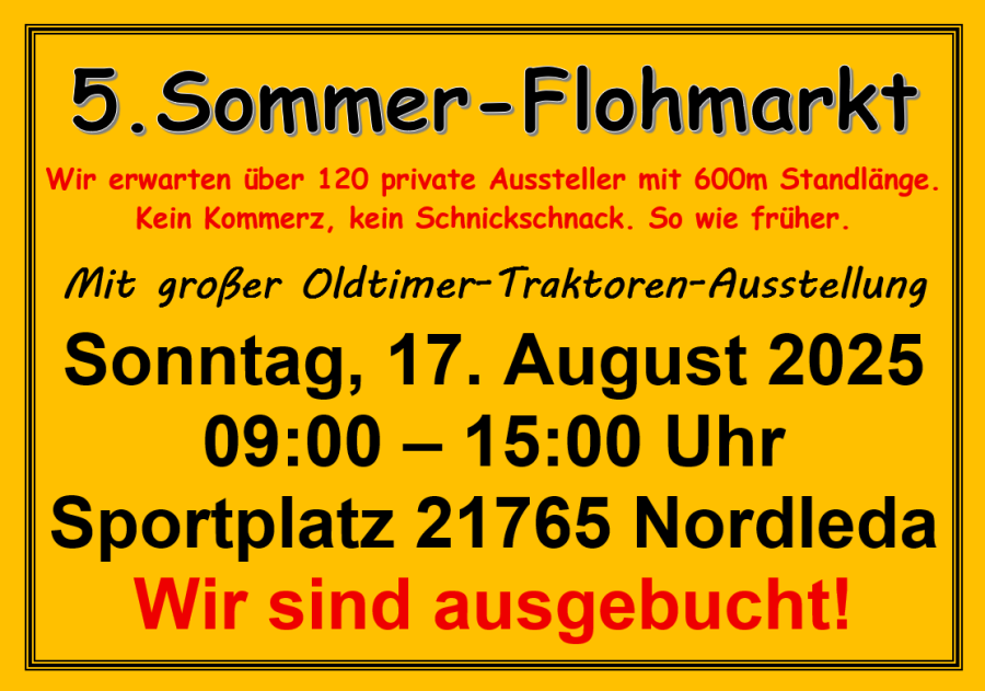 Am kommen Sonntag, den 17. August findet in der Zeit von 9 bis 15 Uhr der 5. Sommer-Flohmarkt in Nordleda auf dem Sportplatz und in der Schützenhalle statt. Bereits mehr als 120 Stände haben ihre Teilnahme zugesagt, mit einer Gesamtlänge von rund 600 Metern. Wie in den Vorjahren wird der Flohmarkt wie zu alten Zeiten gestaltet: ohne Kommerz und Schnickschnack, dafür mit echten Schnäppchen und einer Ausstellung mit Oldtimer-Traktoren, die zum Verweilen einlädt.